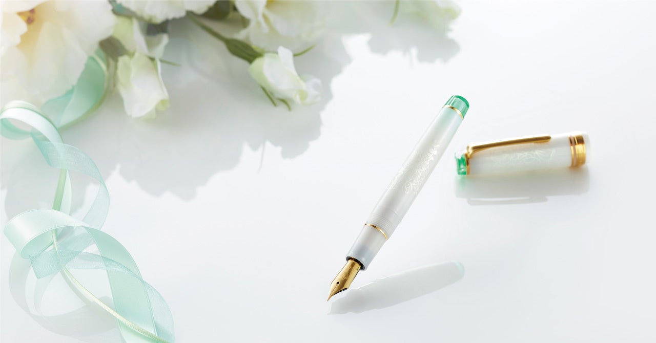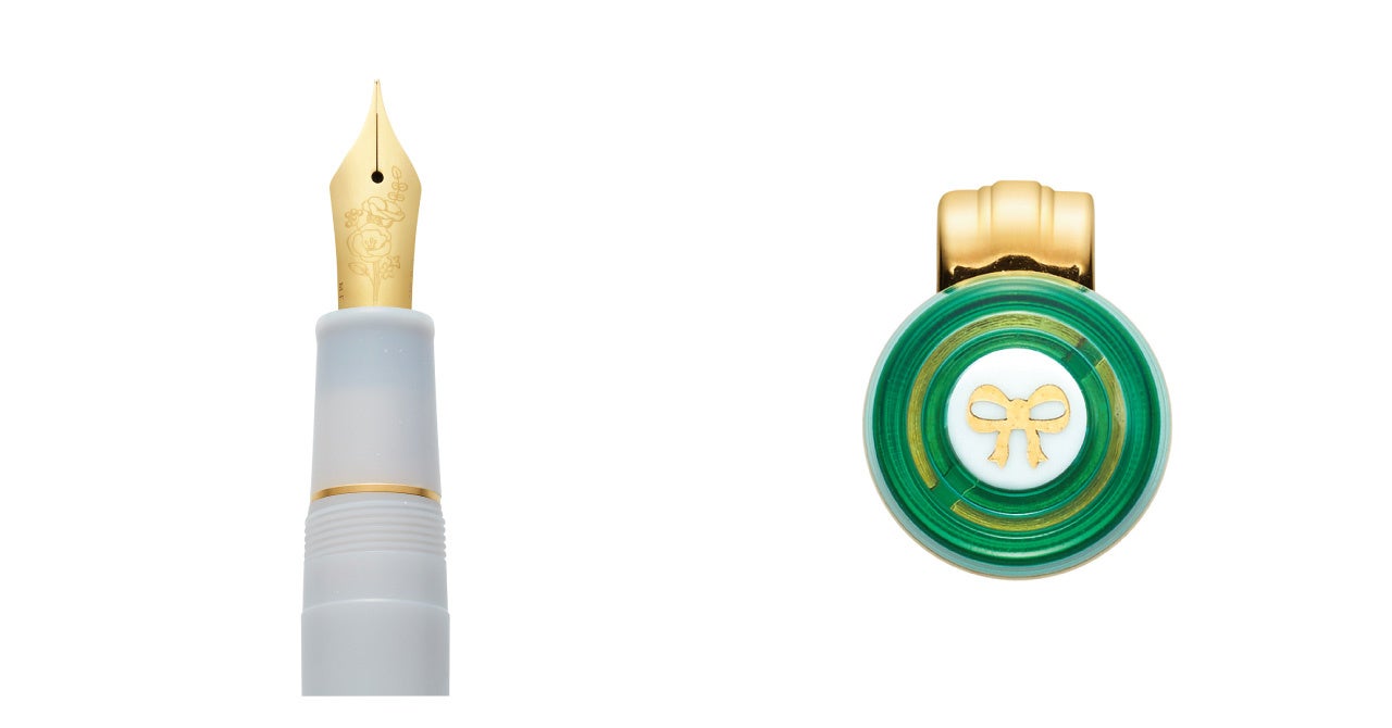 Based on white with glitter, a ribbon is designed for the lid, and a bouquet of Turkish ginkgo is designed for the body and nib. The lid and body handle can be enjoyed changing from white to green or pink depending on the viewing angle. The elastic nib unique to 21K gold expands the joy of writing with a smooth and pleasant writing taste. Three types of character width are available. A special fountain pen commemorating the 1st anniversary.