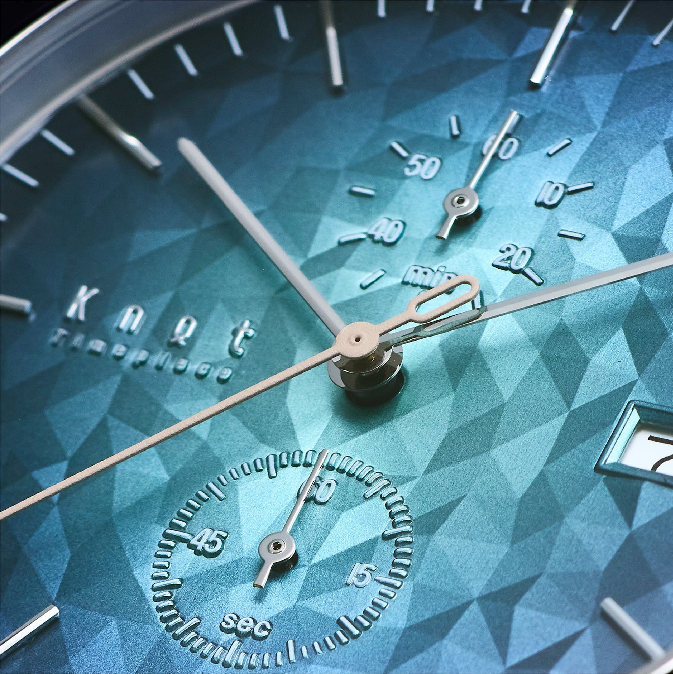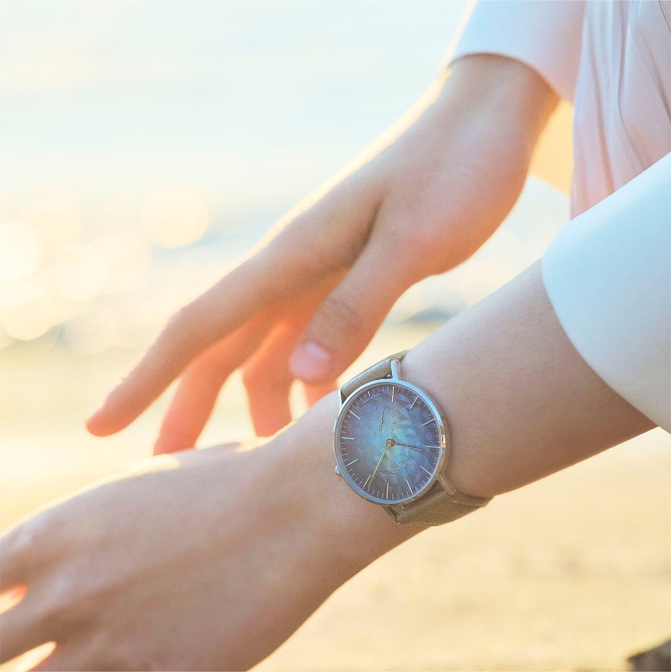 The gently crashing waves are expressed in a three-dimensional geometric pattern. The delicate unevenness of the board surface changes its expression depending on the angle, like the sparkling waves of spring nagisa. The sparkling board surface has a semi-matte finish that expresses the soft light of spring. As an accent, a color inspired by a sandy beach is used for the hands. The color of the sea changes from offshore to nagisa is expressed in a gradation.