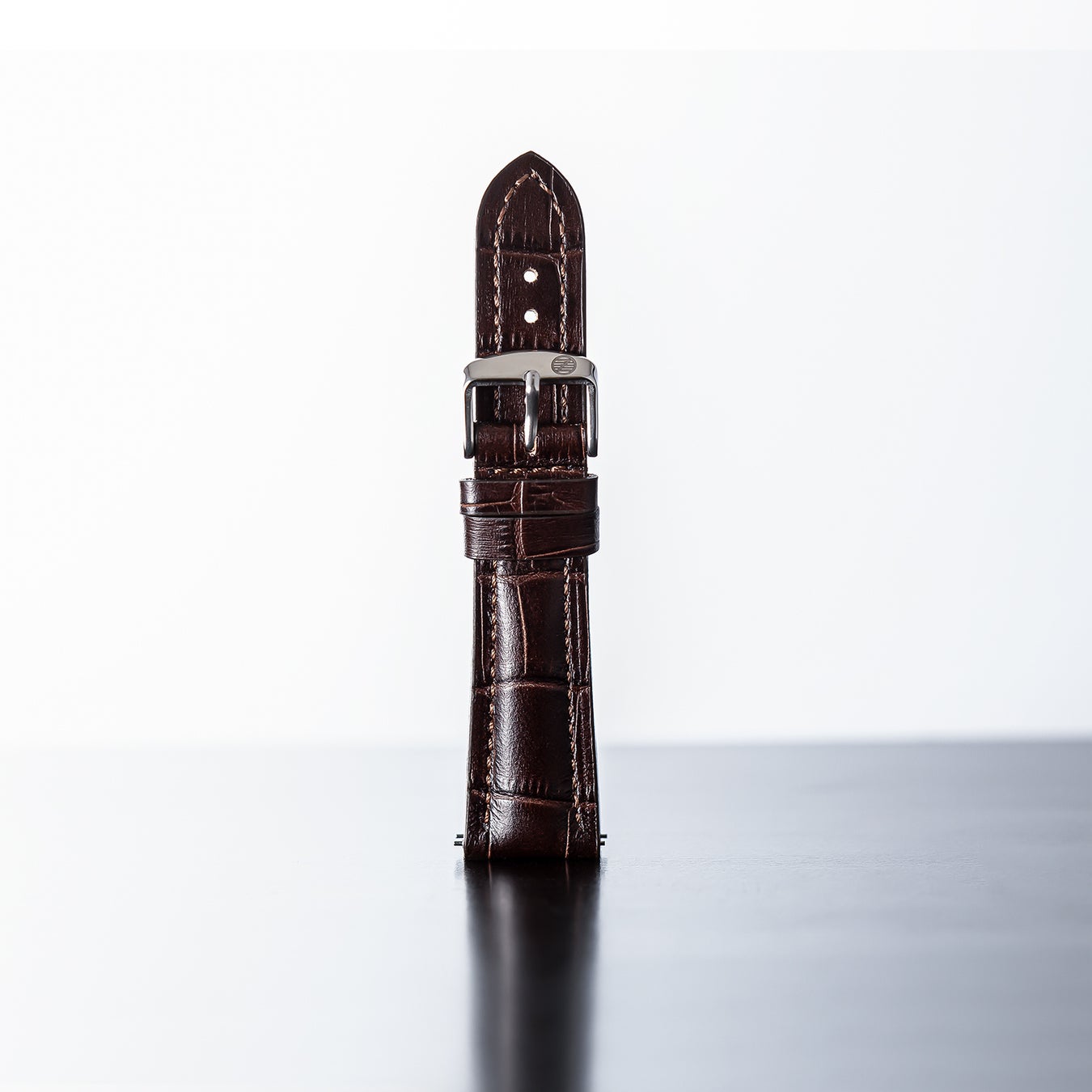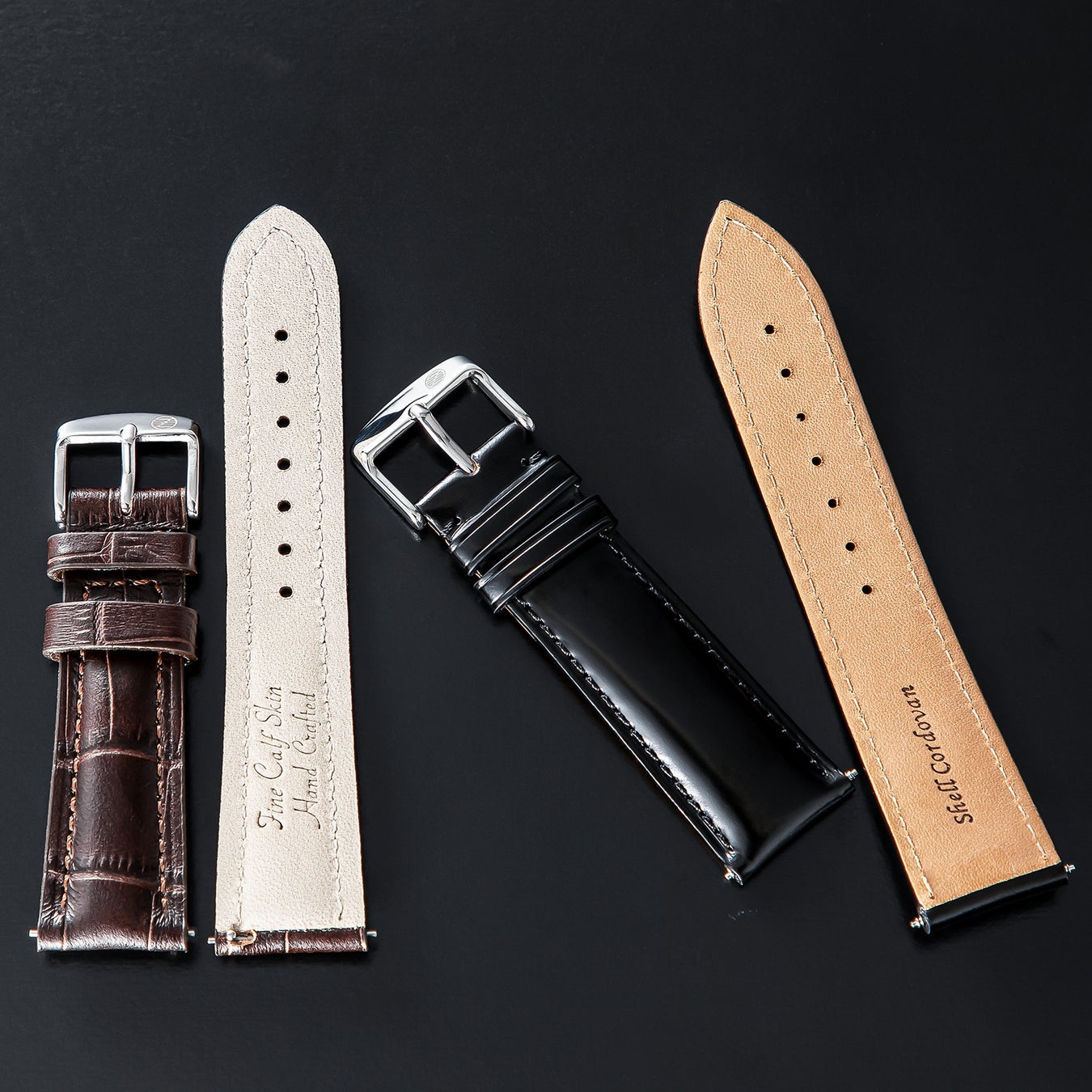 In addition to the black cordovan belt, a dark brown German handmade craft calf leather belt is included. Croco-embossed and offering two different types of elegance.