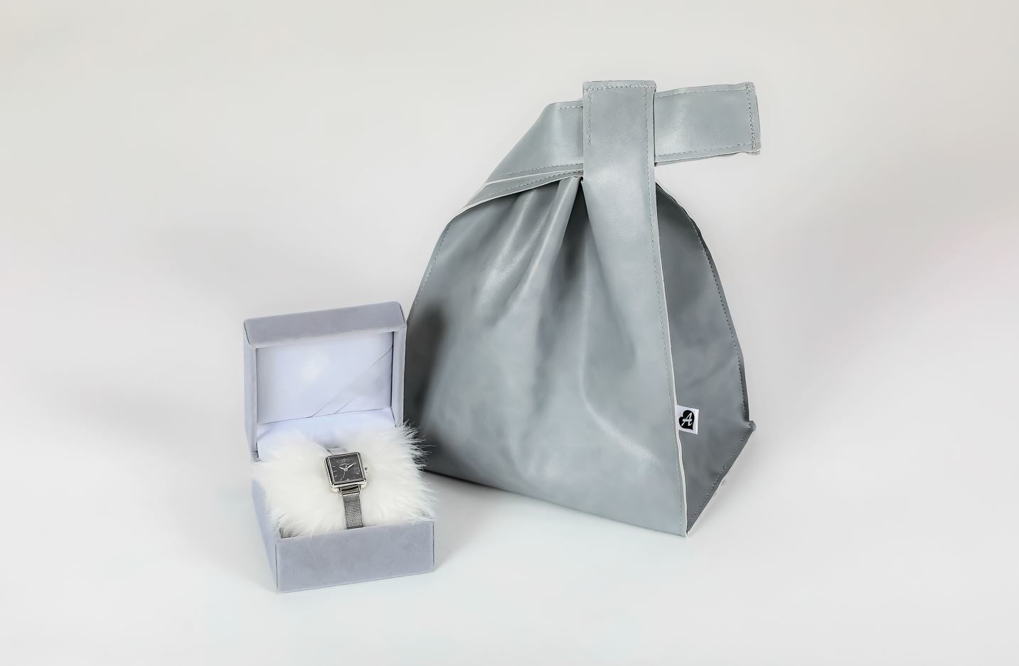 The suede-like gray watch box that matches the color of the wristwatch has a fluffy cushion that makes you feel better every time you open it.