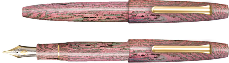 Equipped with a super-large 21-karat gold longsword sharpening nib, the “Umesaki” has a heavy ebonite fountain pen with flyer work on layered ebonite wood. This product is the seventh in a series that uses colored ebonite wood with a motif of Japan paintings, and this time the motif is “Famous Edo 100 Views Kameido Umeya Store” by Utagawa Hiroshige.