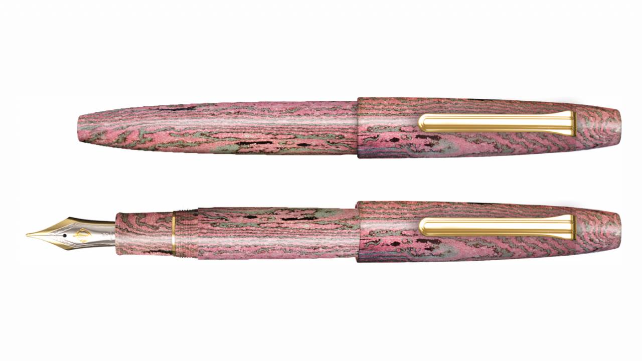 Equipped with a super-large 21-karat gold longsword sharpening nib, the “Umesaki” has a heavy ebonite fountain pen with flyer work on layered ebonite wood. This product is the seventh in a series that uses colored ebonite wood with a motif of Japan paintings, and this time the motif is “Famous Edo 100 Views Kameido Umeya Store” by Utagawa Hiroshige.