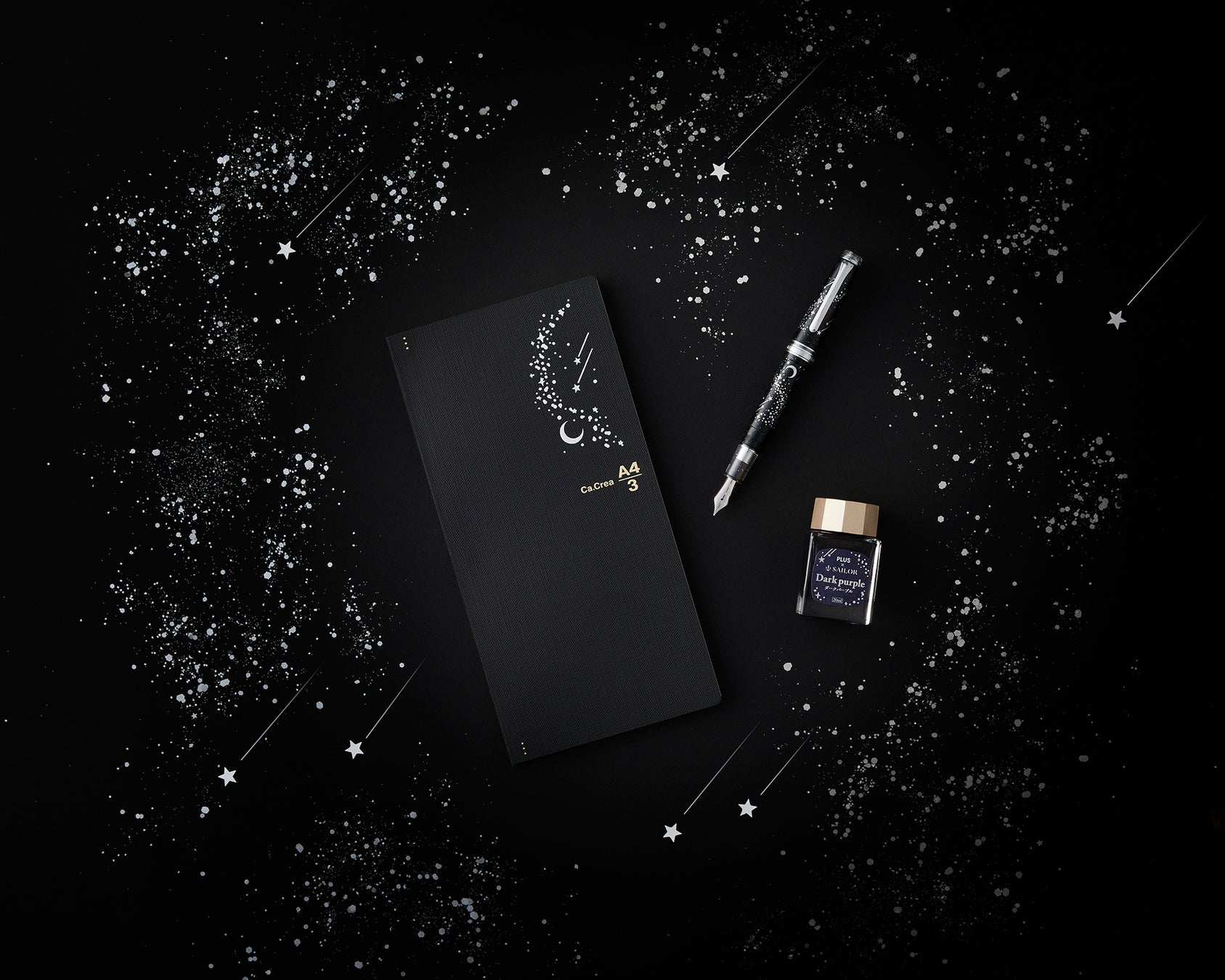 The theme of the sixth collaboration project is “Starry Sky”. In the notebook, the beautiful starry sky of the meteor shower is expressed with silver foil. The fountain pen has a clear black body reminiscent of a clear sky, with fine silver glitter inspired by stars and bright stars and the moon. The 14-karat gold nib and lid plug are also decorated with a one-point first-magnitude star pattern. In addition, the ink color is a new dark purple color inspired by the starry sky. The gift box also uses a color reminiscent of the starry sky. This is a gleaming stationery set that makes you want to think about the starry sky and keep a notebook or diary at the end of the day.