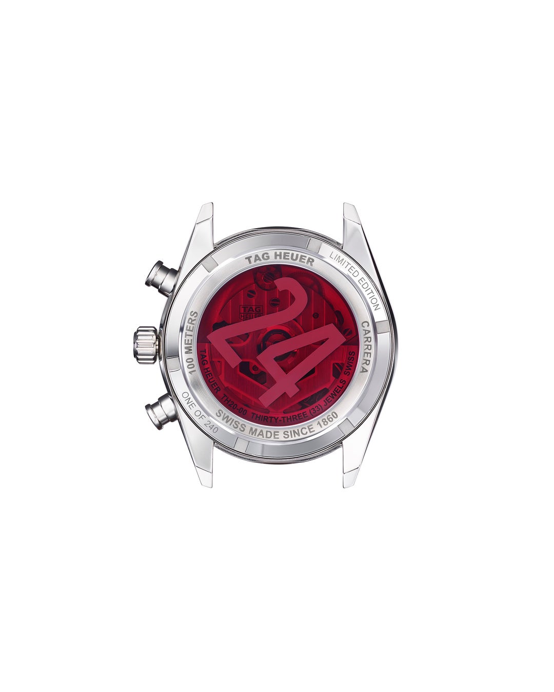 Peeking out from the caseback of the TAG Heuer Carrera Chronograph Japan Limited Edition, the TH20-00 movement boasts an excellent power reserve of around 80 hours. Each watch is engraved with “ONE OF 240” on the caseback to indicate that it is one of a limited edition of 240 watches and comes with a perforated black calf strap.